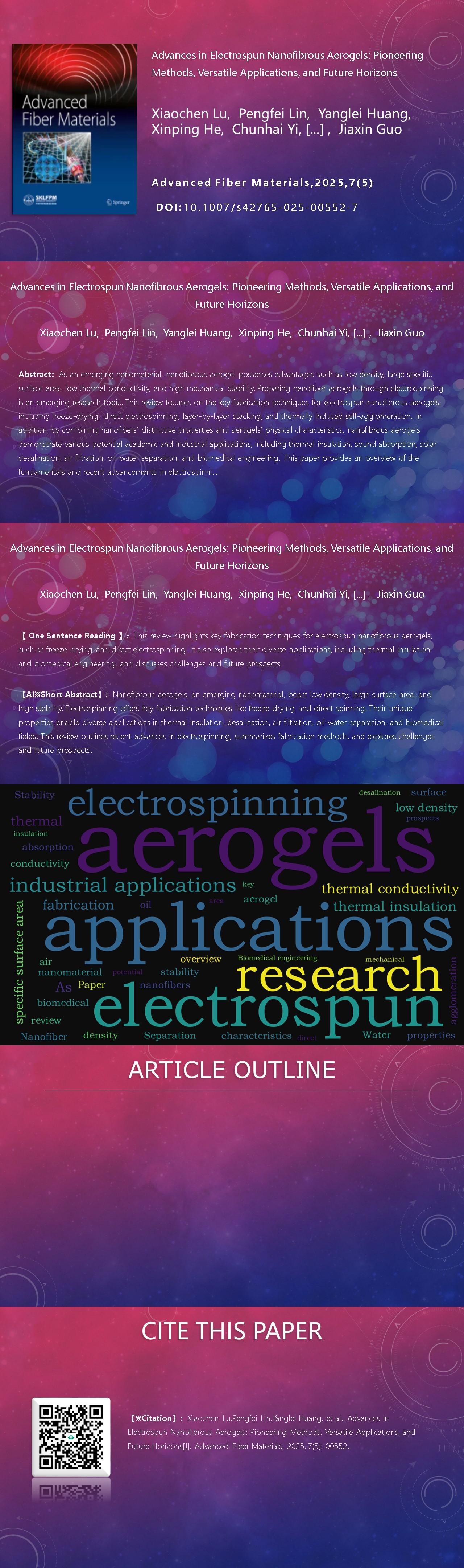 Xiaochen Lu, Pengfei Lin, Yanglei Huang, Xinping He, Chunhai Yi, Jiawei Sun, Muhammad Usman Farid, Alicia Kyoungjin An, Jiaxin Guo. Advances in Electrospun Nanofibrous Aerogels: Pioneering Methods, Versatile Applications, and Future Horizons[J]. Advanced Fiber Materials, 2025, 7(5): 00552