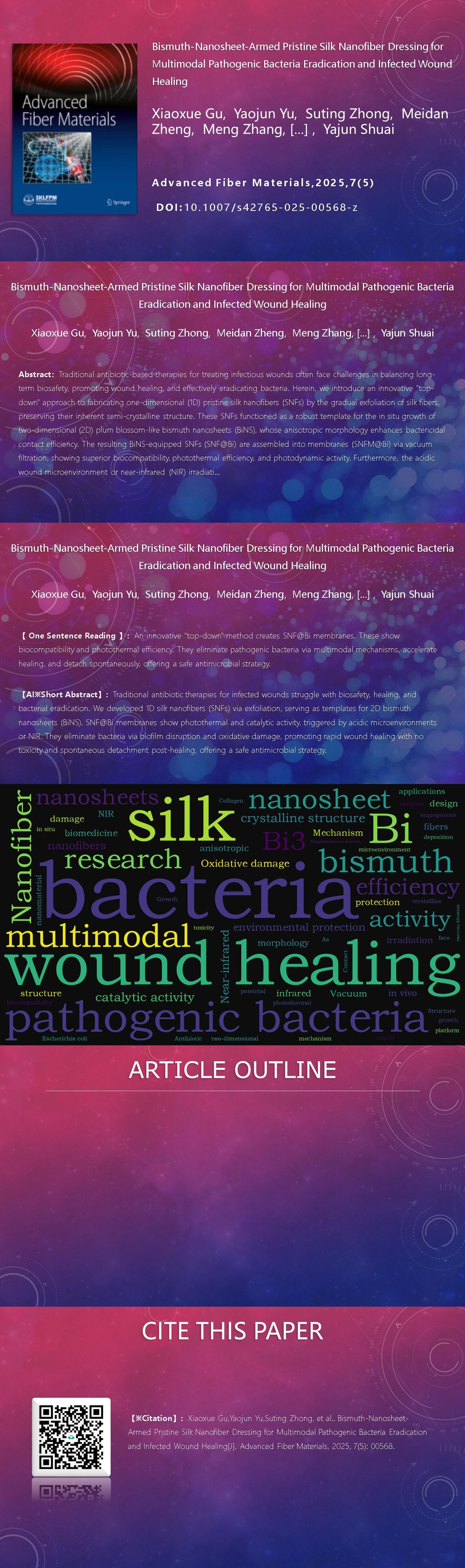 Xiaoxue Gu, Yaojun Yu, Suting Zhong, Meidan Zheng, Meng Zhang, Jie Wang, Zongpu Xu, Quan Wan, Subhas C. Kundu, Mingying Yang, Yajun Shuai. Bismuth-Nanosheet-Armed Pristine Silk Nanofiber Dressing for Multimodal Pathogenic Bacteria Eradication and Infected Wound Healing[J]. Advanced Fiber Materials, 2025, 7(5): 00568