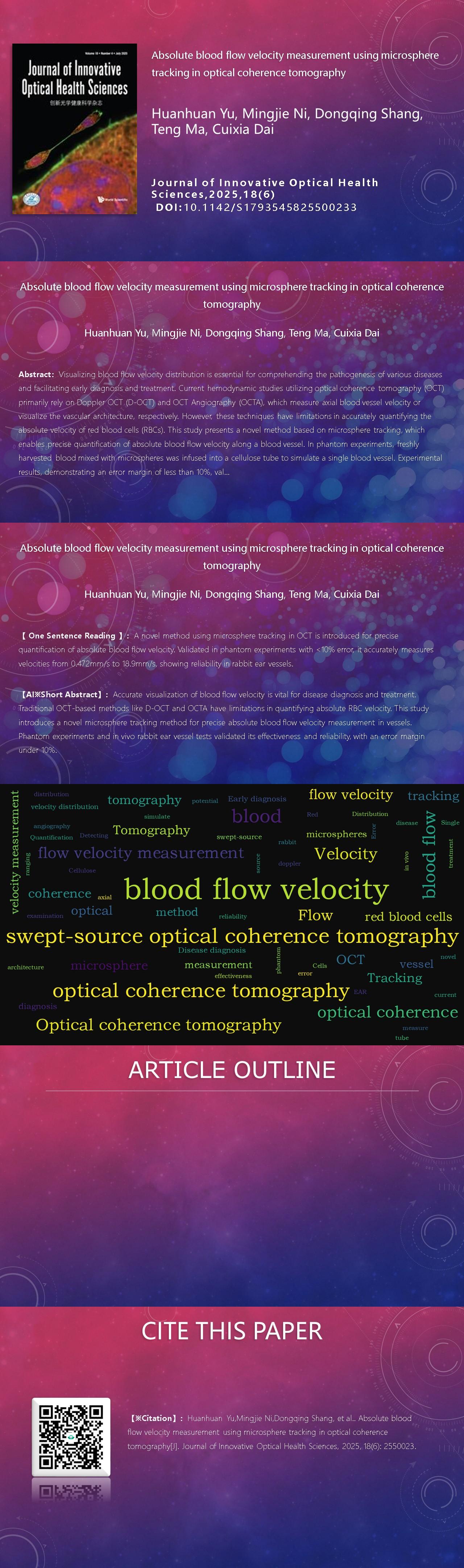 Huanhuan Yu, Mingjie Ni, Dongqing Shang, Teng Ma, Cuixia Dai. Absolute blood flow velocity measurement using microsphere tracking in optical coherence tomography[J]. Journal of Innovative Optical Health Sciences, 2025, 18(6): 2550023