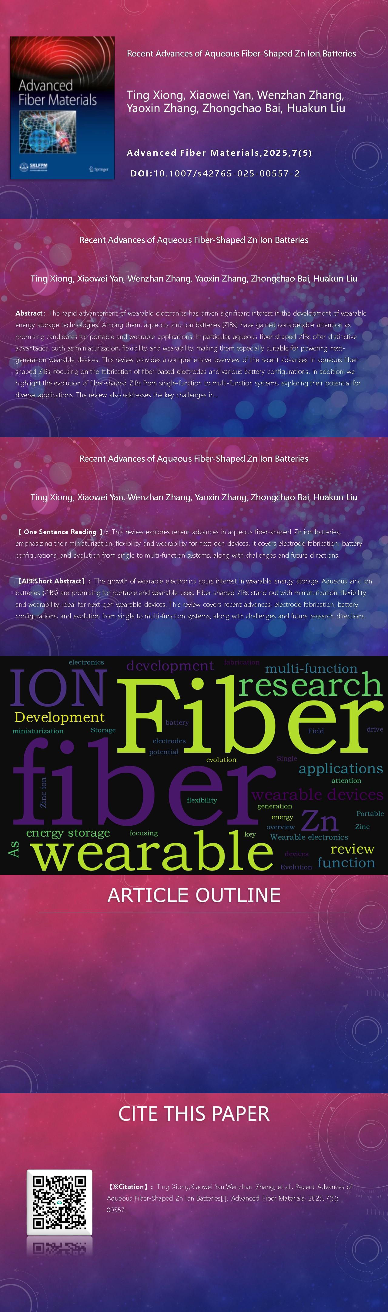 【AIGC Short Abstract】:The growth of wearable electronics spurs interest in wearable energy storage. Aqueous zinc ion batteries (ZIBs) are promising for portable and wearable uses. Fiber-shaped ZIBs stand out with miniaturization, flexibility, and wearability, ideal for next-gen wearable devices. This review covers recent advances, electrode fabrication, battery configurations, and evolution from single to multi-function systems, along with challenges and future research directions.