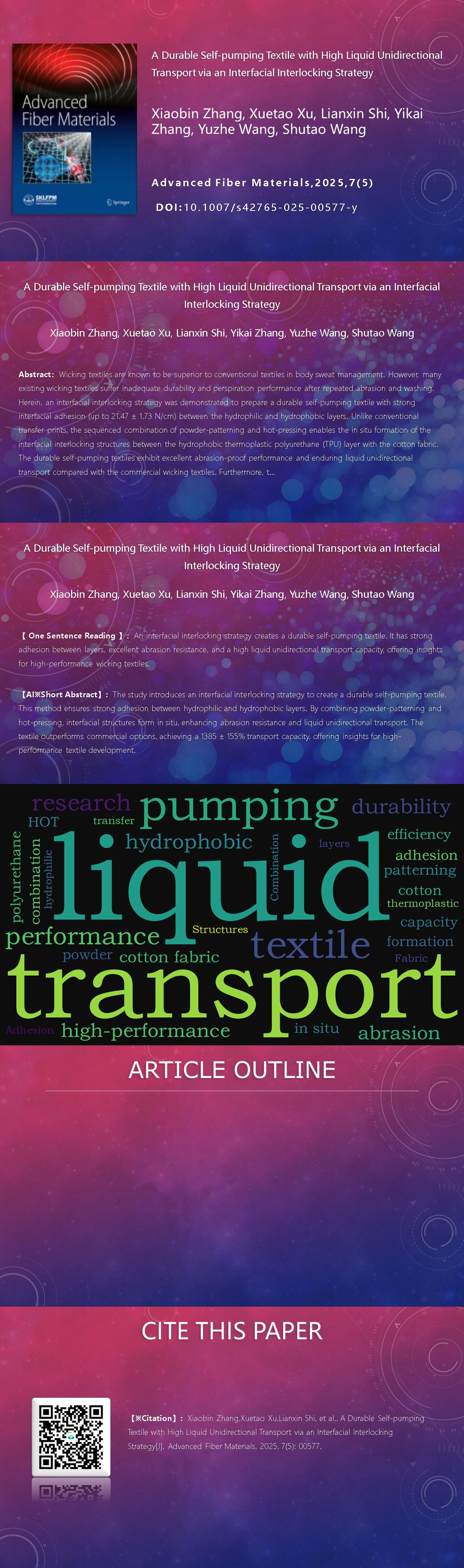 【AIGC One Sentence Reading】:An interfacial interlocking strategy creates a durable self-pumping textile. It has strong adhesion between layers, excellent abrasion resistance, and a high liquid unidirectional transport capacity, offering insights for high-performance wicking textiles.