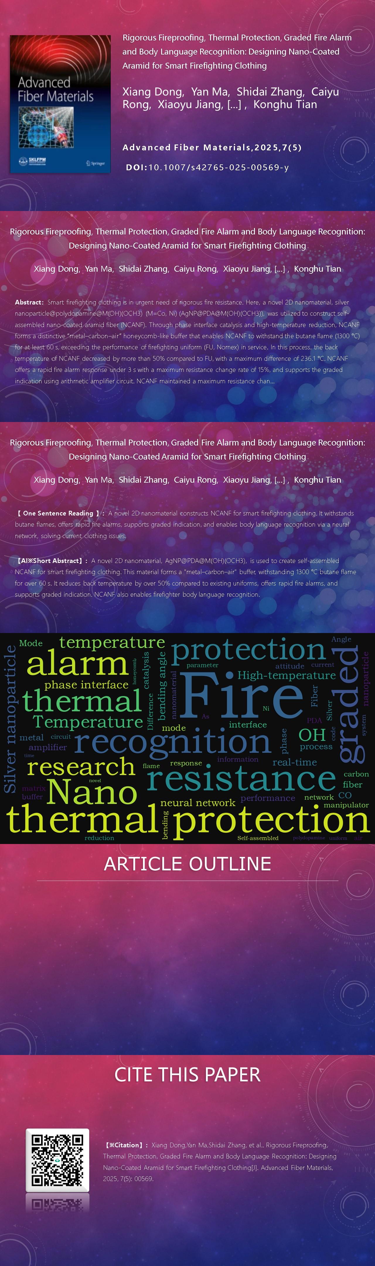 Xiang Dong, Yan Ma, Shidai Zhang, Caiyu Rong, Xiaoyu Jiang, Yan Li, Shibin Nie, Konghu Tian. Rigorous Fireproofing, Thermal Protection, Graded Fire Alarm and Body Language Recognition: Designing Nano-Coated Aramid for Smart Firefighting Clothing[J]. Advanced Fiber Materials, 2025, 7(5): 00569