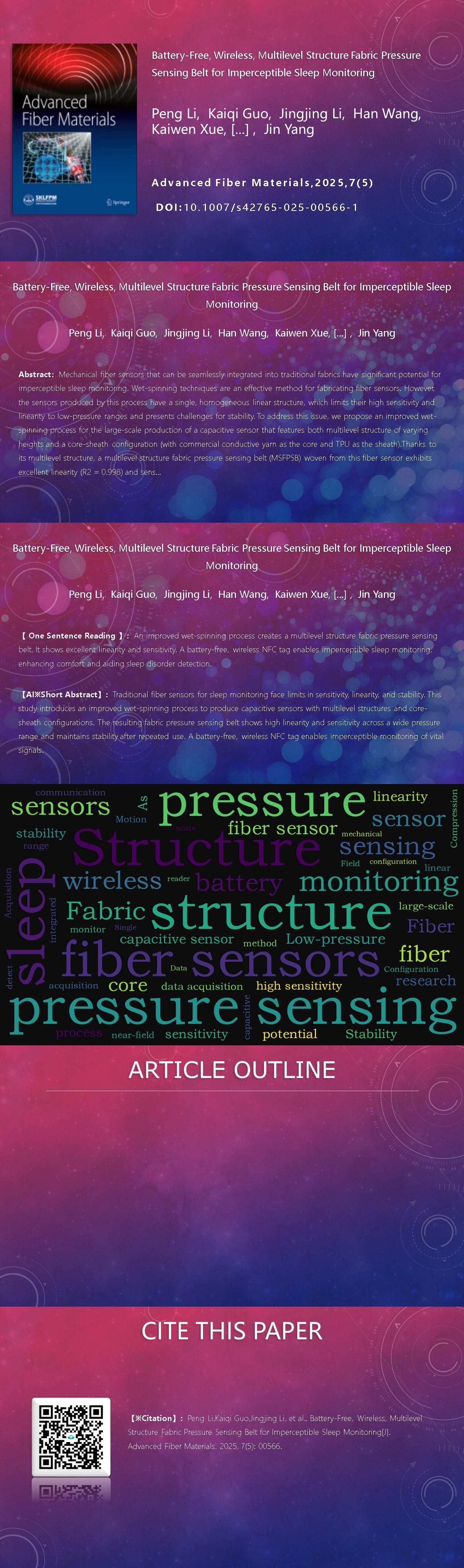Peng Li, Kaiqi Guo, Jingjing Li, Han Wang, Kaiwen Xue, Hong Lin, Feihong Ran, Bo Zhang, Quanzhong Zhang, Fujing Xie, Yuanhang Xu, Jin Yang. Battery-Free, Wireless, Multilevel Structure Fabric Pressure Sensing Belt for Imperceptible Sleep Monitoring[J]. Advanced Fiber Materials, 2025, 7(5): 00566