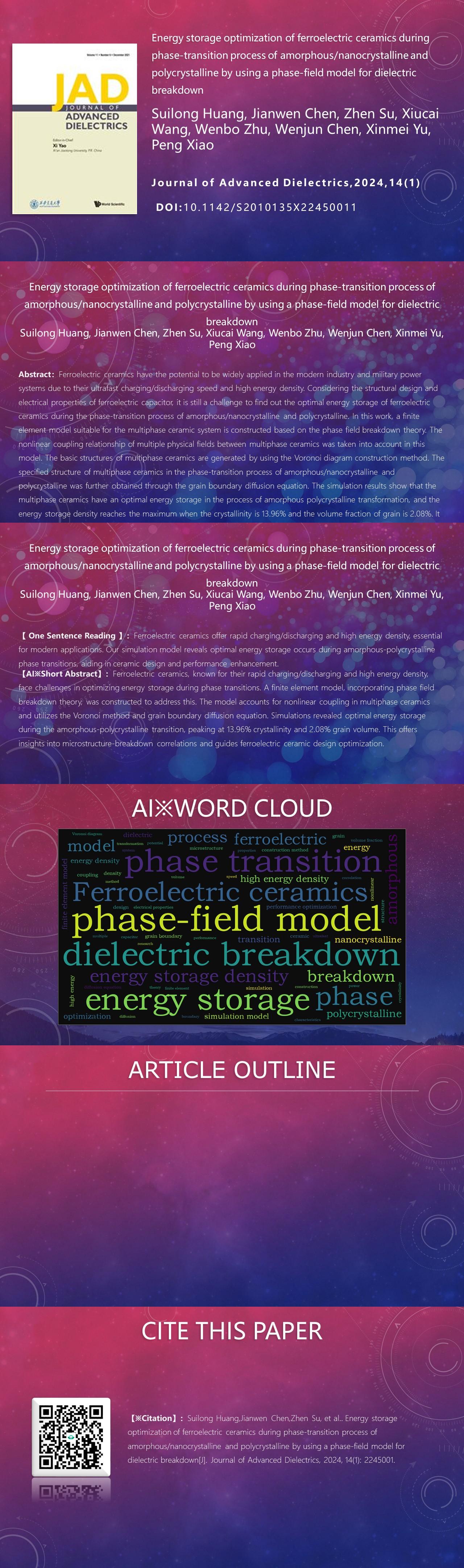 Suilong Huang, Jianwen Chen, Zhen Su, Xiucai Wang, Wenbo Zhu, Wenjun Chen, Xinmei Yu, Peng Xiao. Energy storage optimization of ferroelectric ceramics during phase-transition process of amorphous/nanocrystalline and polycrystalline by using a phase-field model for dielectric breakdown[J]. Journal of Advanced Dielectrics, 2024, 14(1): 2245001